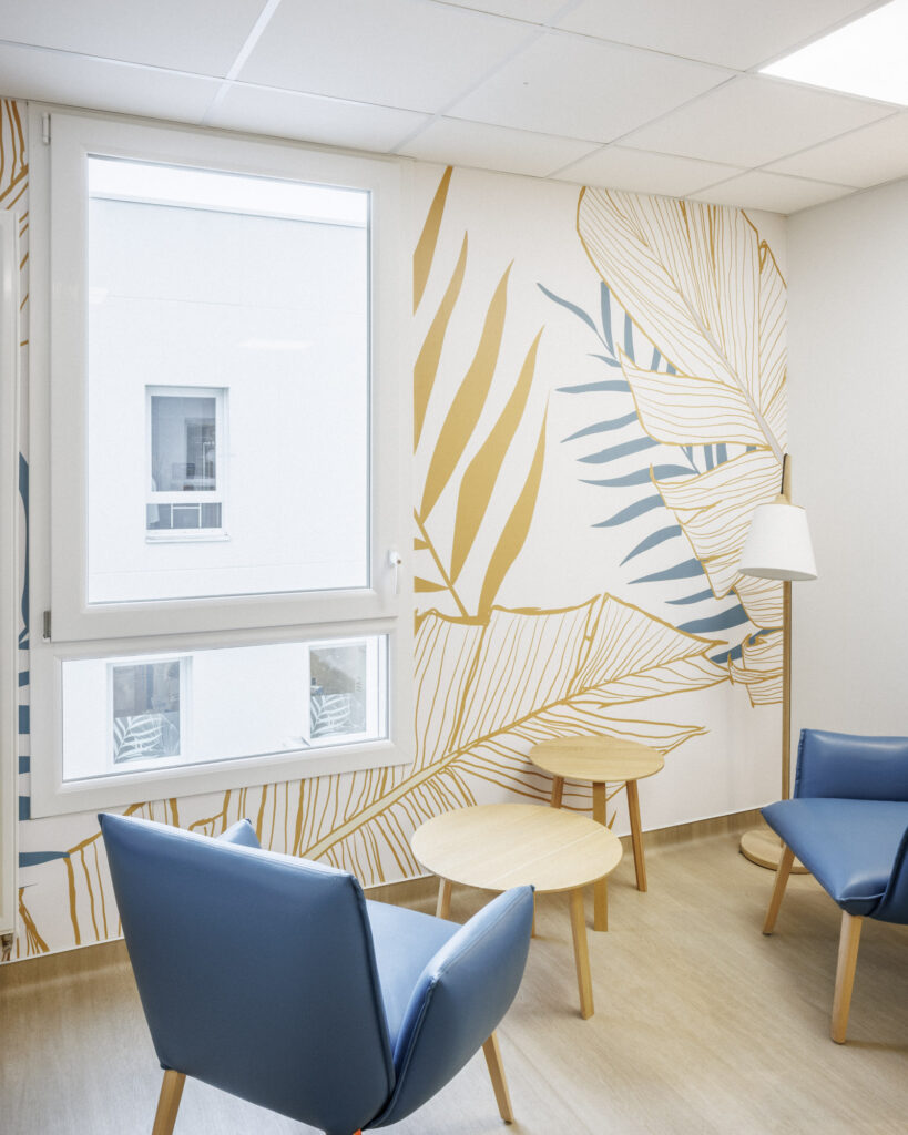 Un motif floral créé sur mesure rythme les parcours et les espaces. Il se décline sur plusieurs teintes, en fonction des niveaux et des services. Au bleu phare du projet s’ajoutent des feuillages aux teintes chaudes ou froides selon les étages et les zones du projet.