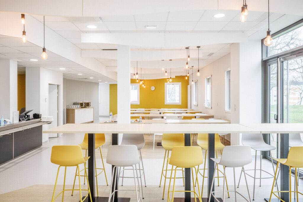 Des espaces communs comme la salle de restaurant, au lieu plus intimistes comme le salon des familles, un soin particulier est apporté aux ambiances. La couleur, le motif vient en touche afin de générer des espaces calmes et apaisants.