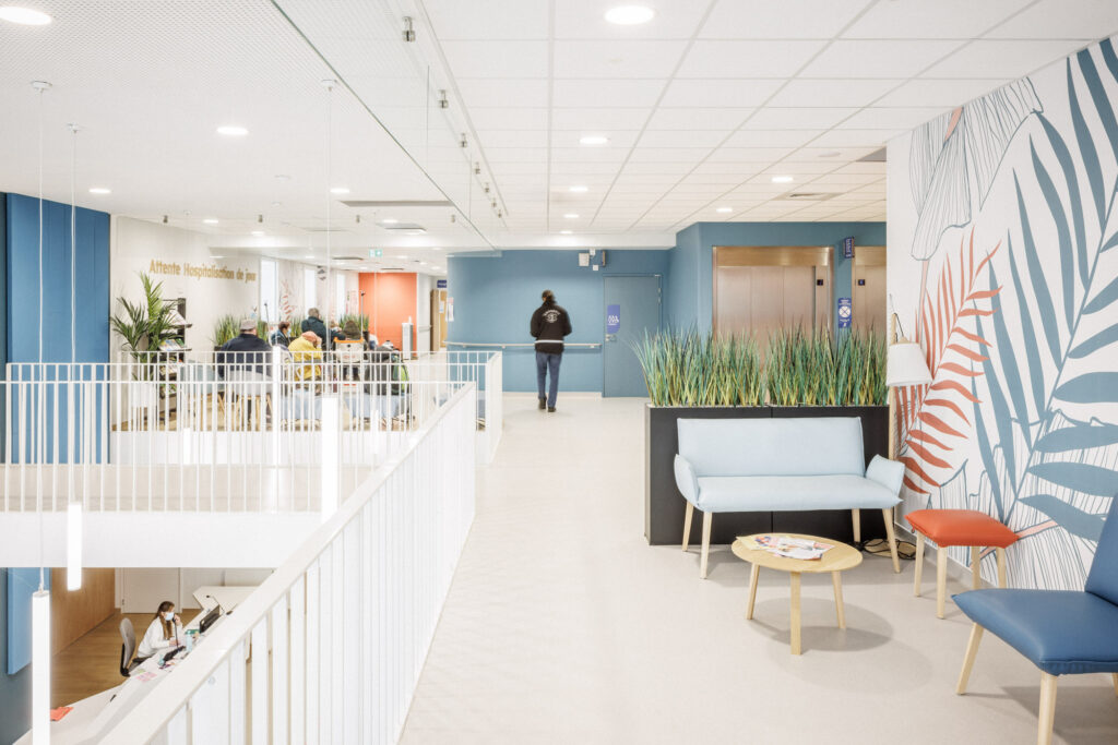 Les zones d’attentes, baignées de lumière, restent ouvertes les unes sur les autres, laissant le parcours patient fluide. Les espaces restent connectés tout en gardant leurs fonctions première et leur intimité. Le motif, véritable repère, vient souligner ces attentes et ponctuer les cheminements.