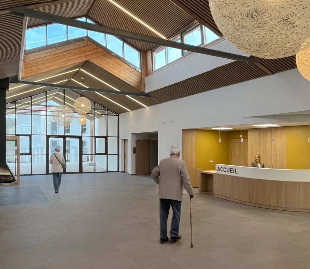 Le hall, situé entre l’EHPAD et le SSR, sert de point d’information central pour résidents, patients et visiteurs. Rythmé par un plafond bois acoustique, il offre une atmosphère chaleureuse et conviviale, renforcée par la cheminée qui apporte une touche domestique rassurante.