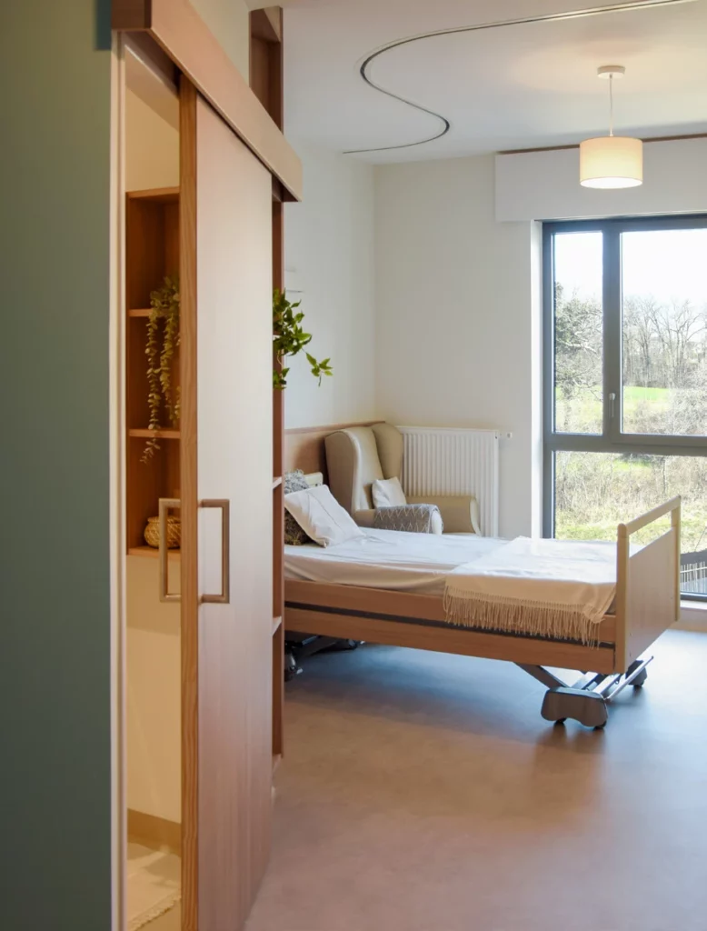 Pensée pour accompagner le parcours des résidents, la signalétique s’adapte aux différents supports. Chaque unité se distingue par une couleur reprise dans les chambres, où le mobilier et la tête de lit sur mesure créent un ensemble confortable et accueillant.