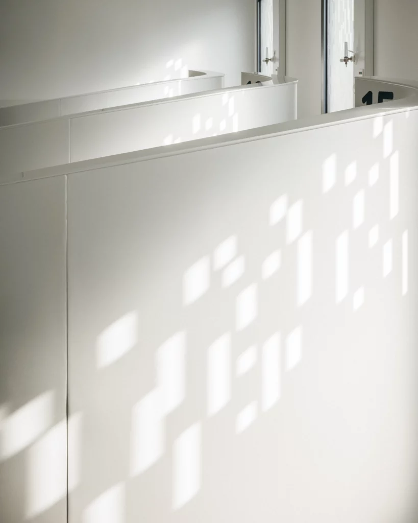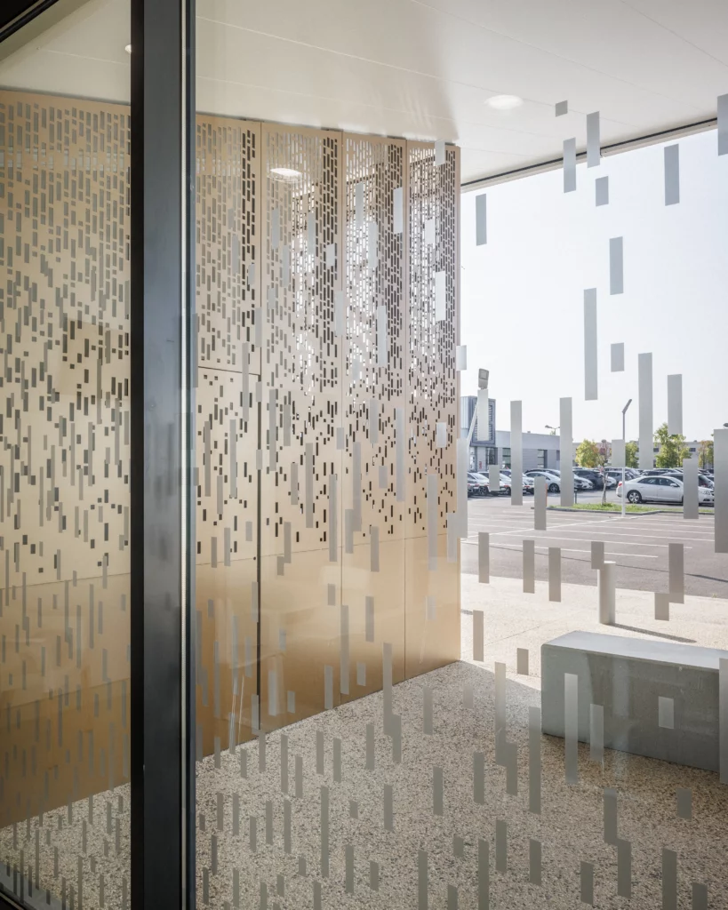 À l’entrée, le motif imaginé par l’Atelier Couleur avec les architectes se décline en façade et vitrage, affirmant une cohérence entre extérieur et intérieur.
