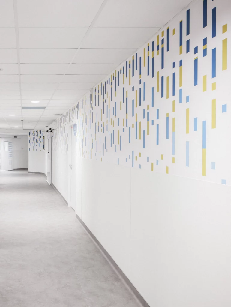 Dans le couloir du bloc opératoire, le motif se réinvente en impression numérique. Une intervention