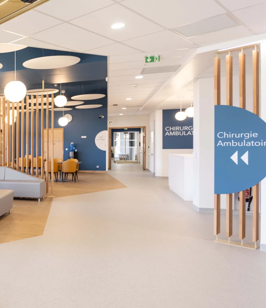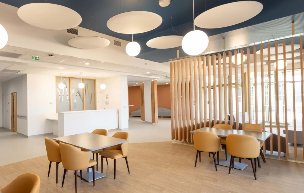 Les espaces d’attente et de convivialité ont été soigneusement conçus pour créer une ambiance chaleureuse tout en privilégiant des matériaux adaptés aux contraintes spécifiques des environnements hospitaliers.